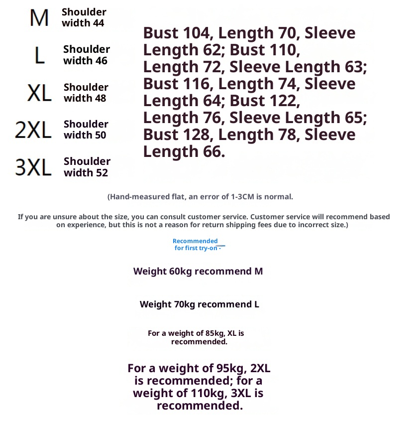1. Asian sizes are 1 to 2 sizes smaller than European and American people. Choose the larger size if your size between two sizes. Please allow 2-3cm differences due to manual measurement. 2. Please check the size chart carefully before you buy the item, if you don't know how to choose size, please contact our customer service. 3.As you know, the different computers display colors differently, the color of the actual item may vary slightly from the following images.